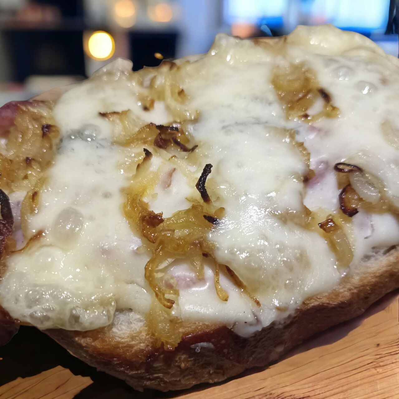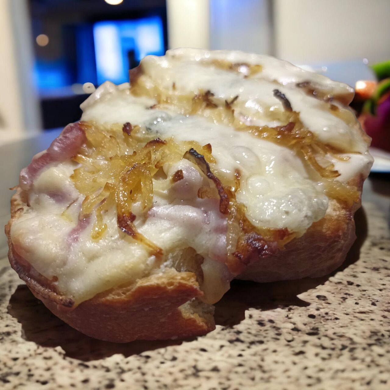 Tartine à déguster chaude au froide. Poulet façon Tika sur un pain artisanal, béchamel maison et emmental râpé!!